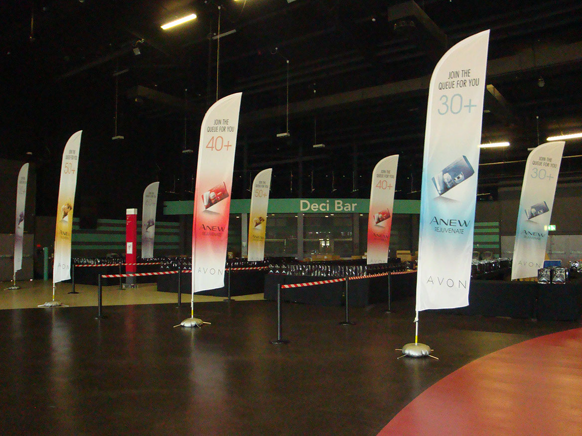 Flags are ideal for lightweight and portable eye-catching displays suitable for use inside and outside. They are available in a range of shapes and sizes and single or double sided. A variety of curved shapes can be created using the same flagpole so you are able to change the shape for different events simply by changing your graphic design. A rectangular shaped flag is also available for maximum brand coverage.