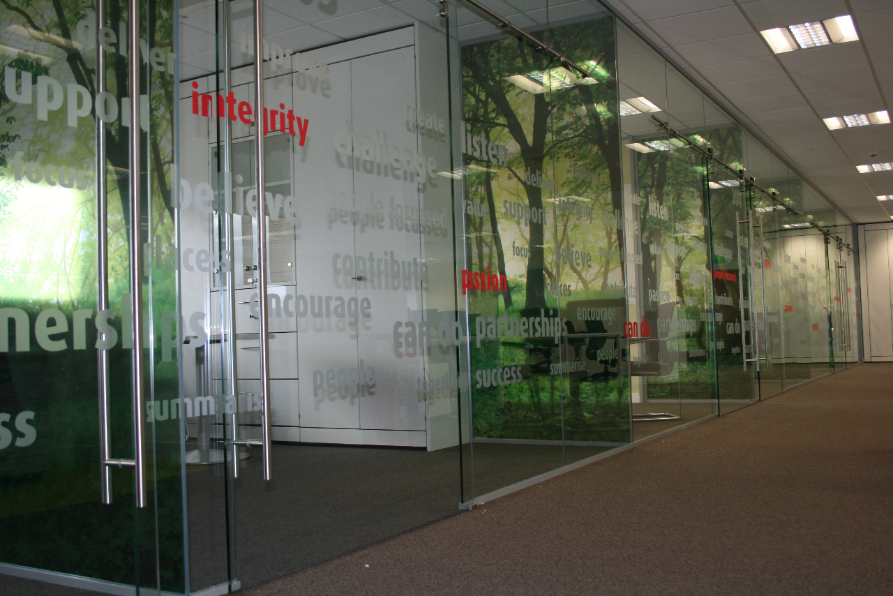 With leading-edge print technology we can help you transform flat or curved glass areas into vibrant, inspired working environments, ideal for advertising, interior decoration, privacy or identity branding , whether short or long term.