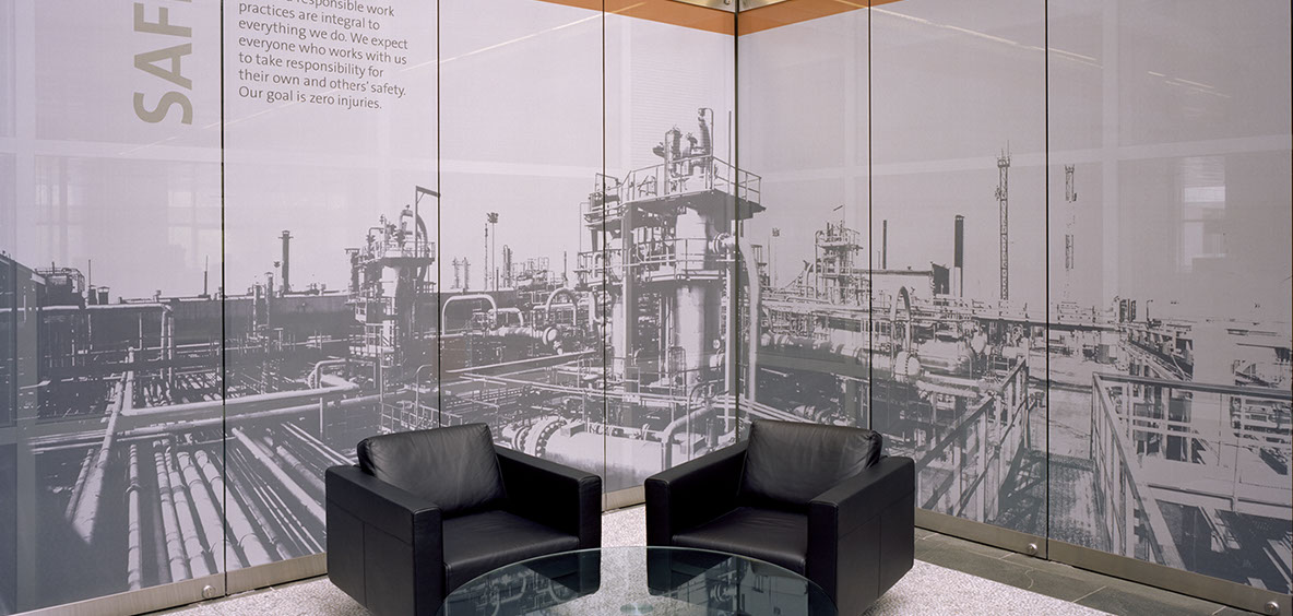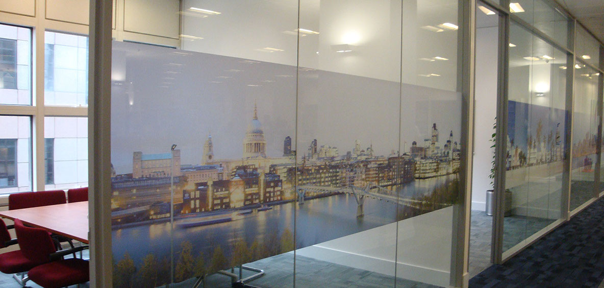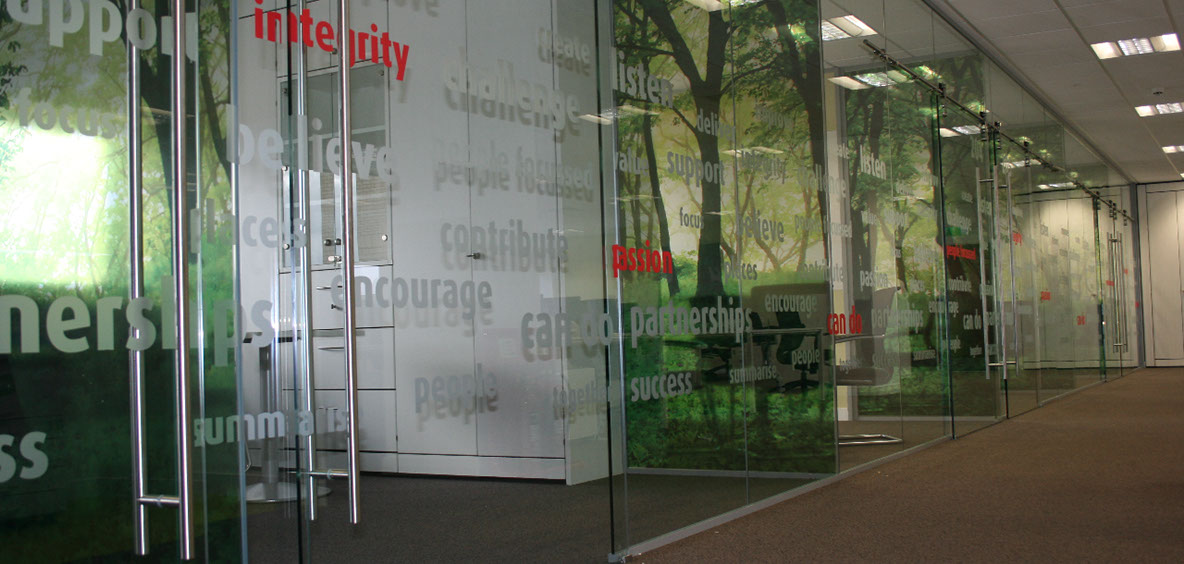 With leading-edge print technology we can help you transform flat or curved glass areas into vibrant, inspired working environments, ideal for advertising, interior decoration, privacy or identity branding, whether short or long term.